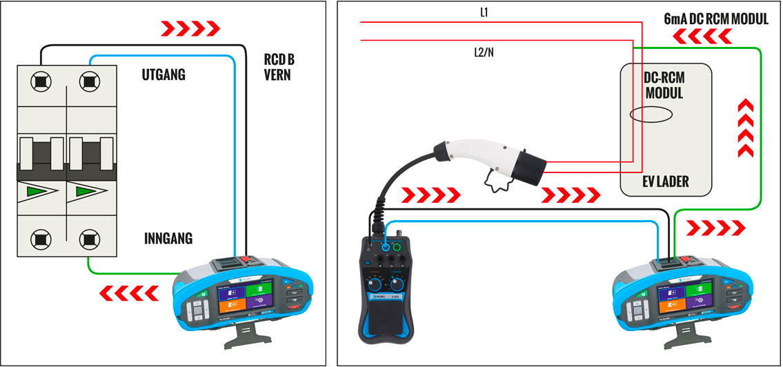 For at vi skal få en ren DC strøm, må vi i stedet for å lede feilstrømmen vår til jord lede den til motsatt fase på «baksiden» av RCD beskyttelsen. Se tegninger for hvordan koble seg opp enten på RCD B vern eller 6mA DC RCM modul. Røde piler indikerer strømmens bane. Når vi tester på denne måten er det viktig at vi har sjekket alle jordforbindelser med kontinuitetsmåling.